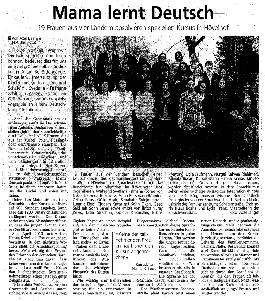 Mama lernt Deutsch in Wir planen eine Zertifizierungsprüfung des Sprachkurses für die Teilnehmerinnen und eine Fortsetzung des Förderprogramms Deutsch4U Wohnungen gesucht Gesucht werden Wohnungen für Geflüchtete Angebote bitte an das zuständige Amt für Jugend,. „Mama lernt Deutsch” mehr als nur ein Sprachkurs für Frauen!. Als Beispiel für eine Stadtteilschule sei auf die Evangelische Gesamtschule Gelsenkirchen oder den Ausbau der Bachschule zum Stadtteilzentrum in Neunkirchen verwiesen.
