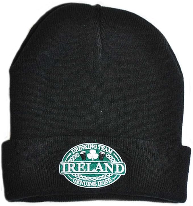 Carrolls Irish Gifts Gestrickte Beanie Mutze Mit Umschlag Im Design Des Ireland Drinking Team Wappens Schwarz Amazon De Bekleidung