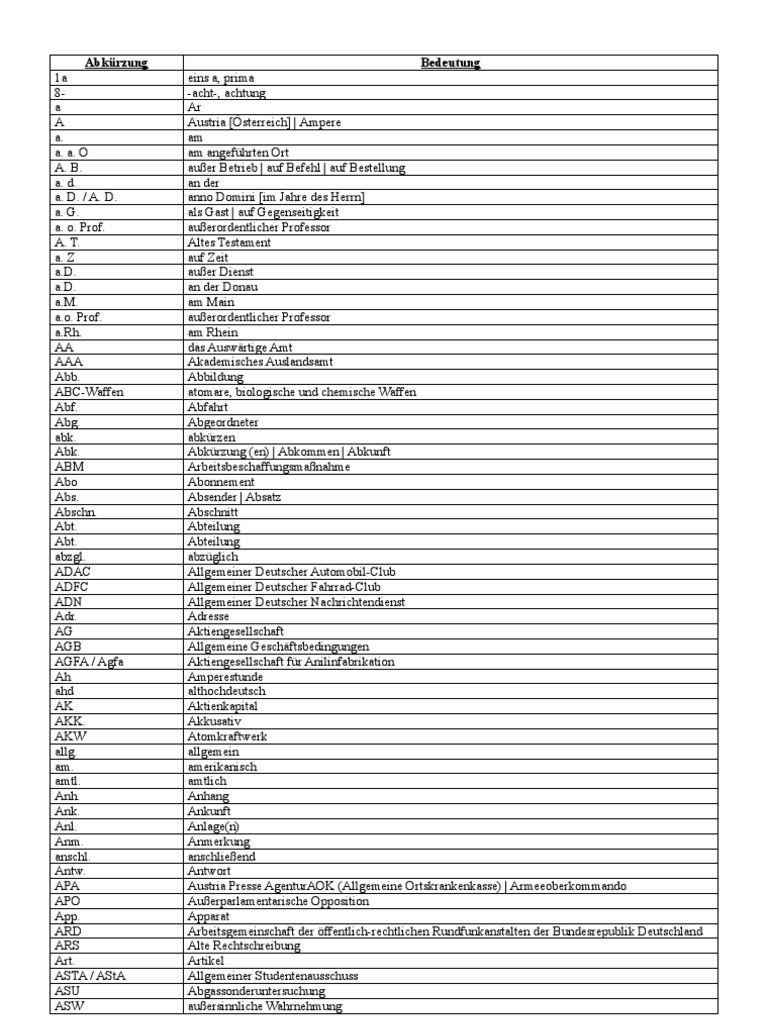 Liste Mit Abkurzungen Abk Allgemeine Abkurzungen 1 Abk