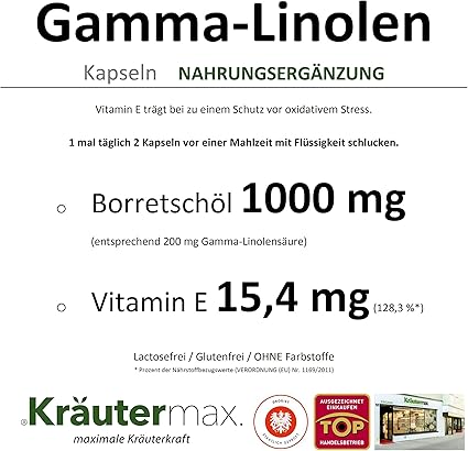 Willkommen bei unserem Livio Öl Test Wir haben für sich die wichtigsten und besten Produkte in dieser Kategorie aufgelistet und in eine entsprechende Reihenfolge gebracht Bei dem Livio Öl Test haben wir auf verschiedenste Faktoren geachtet Mit unseren Vergleichen versuchen wir ihnen ein besseres Bild zu verschaffen, damit sie selbst entscheiden können, welches Produkt aus dem Livio Öl. GammaLinolensäure kann theoretisch aus gentechnisch veränderten Pilzen gewonnen werden In der Praxis ist dies allerdings nicht üblich Um sicherzugehen, dass das Präparat gentechnikfrei ist, kaufen Sie GammaLinolensäure aus Ölen wie Nachtkerze, Borretsch oder aus den Samen der schwarzen Johannisbeere ×. Variation an der Kasse je nach Lieferadresse Informationen zur gesenkten USt in Deutschland Borretschöl Kapseln Borretschöl enthält natürlicherweise Omega6 Fettsäuren, darunter auch GammaLinolensäure ( 100 mg pro Kapsel 0mg pro esdosis) Mit Vitamin E Die Borretschöl Kapseln enthalten hochwertiges Vitamin E zum Schutz der Zellbestandteile vor oxidativen Schäden.