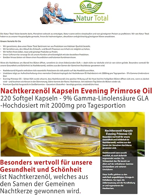 . Primrose 1300, 60 Weichkapseln Ihr Körper braucht Fettsäuren zum Überleben, da er nicht alle selbst herstellen kann Linolsäure, aus der Omega6Familie und AlphaLinolensäure (ALA) aus der Omega3Familie müssen über die Ernährung zugeführt werden und werden daher als essentielle Fettsäuren bezeichnet. Jede Kapsel enthält 500 Milligramm kaltgepresstes Nachtkerzenöl, der durchschnittliche Gamma Linolensäure Gehalt ist mit 9 Prozent ausgewiesen Der Hersteller empfiehlt, dreimal täglich 2 Kapseln einzunehmen.