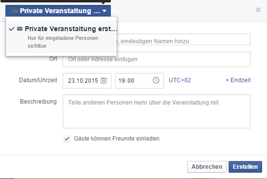 Zum Erstellen und Verwalten einer Facebook Veranstaltung Facebook können Sie Ihre Freunde zu Veranstaltungen ohne die Kosten und Zeit Investitionsbedarf für das Versenden von Einladungen per US Mail einladen Einfach einladen, jeder auf Ihre FacebookFreunde Liste elektronisch und haben Facebook, benachric. A Facebook event's privacy settings can't be changed after it's created. Erstellen Sie Facebook Veranstaltungen, um genau die Zielgruppe über Ihre Pläne zu informieren, die Sie erreichen möchten Über eine Veranstaltung bei Facebook können Sie Ihren Abonnenten, Kunden und auch Interessenten auf eine Veranstaltung aufmerksam machen Sie haben eine Wiedereröffnung, einen der offenen Tür, längere Öffnungszeiten, ein Release oder andere besondere Events.