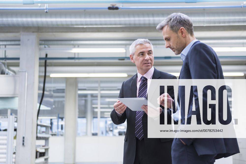 Businessmen During Meeting With Tablet In Production Hall Elevated View Responsibility Shop Floor Stock Photo