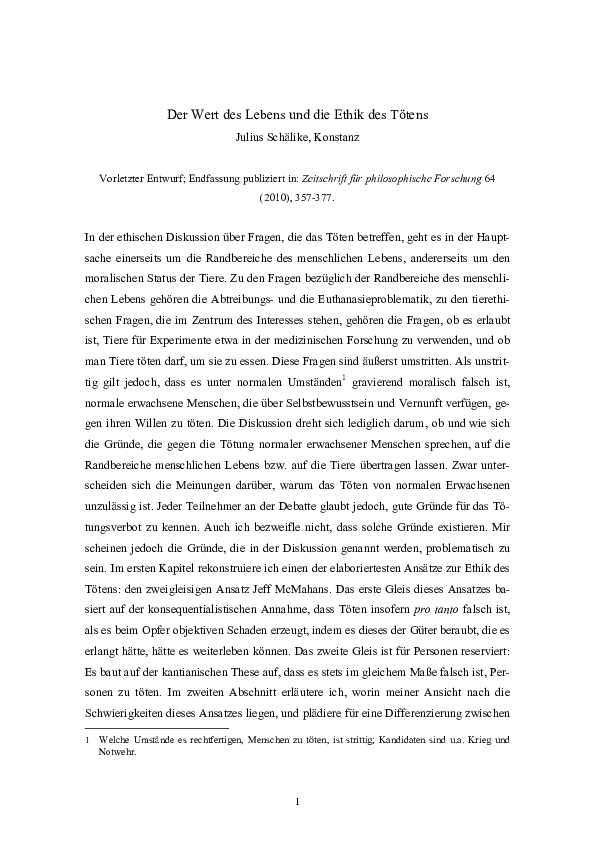 Pdf Der Wert Des Lebens Und Die Ethik Des Totens In Zeitschrift Fur Philosophische Forschung 64 10 357 377 Julius Schalike Academia Edu