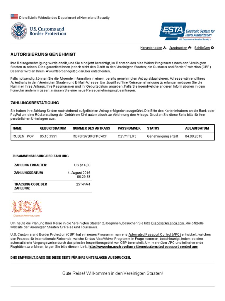 Bei mir ist es nur eine Reihe ,eine kleine Tabelle ,wo Antragsnr,Reisepassnr,Ausstellungsland,Name,und ESTA Status stehtunten steht nochmal das ZahlungsdatumIst das alles?. ESTA approval only authorizes a traveler to board a carrier for travel to the US under the VWP In all cases, CBP officers make admissibility determinations at our ports of entry costs 14 US Dollars After entering the US you may travel to Canada, Mexico or the Caribbean within 90 days and reenter the US using any mode of transport You. Seit dem 12 Januar 09 müssen alle Staatsangehörigen von VWPLändern, die zeitweilig aus geschäftlichen oder privaten Gründen in die Vereinigten Staaten reisen, vor Reiseantritt per Flugzeug oder Schiff in die Vereinigten Staaten eine ReiseGenehmigung beantragen.