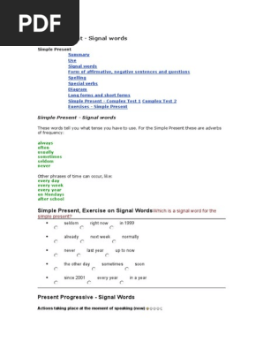 When forming the simple present you have to put an “s” to the “verb” in the third person singular!. Signal words * Present Simple Tense * Part 6 * 4 pages * 10 tasks * grammar explanation * key is included * for intermediate ss This part is about the signal words for intermediate or upperintermediate level There are 3 translation tasks, a mixed sentence task;. Keywords to indicate the presence of Simple Present Tense Keywords to indicate the presence of Simple Present Tense Keywords to indicate the presence of Simple Present Tense Always;.