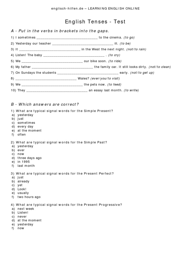 Look!, currently presently present simple always every never normally often. This ws helps the ss learn the signal words in present perfect and how to use them Hope you like it The pics are from fumirajp Hugs, Zsuzsapszi The present downloadable teaching material is recommended for high school, elementary school and adults at Preintermediate (), Intermediate (B1) and Upperintermediate (B2) level. How to express time by using different tenses for 'Past', 'Present', 'Future', 'Future Past', which signal words usually go with the tenses, Zeiten im Englischen Grammar Tenses formssignalsfunctions on the website for teachers and learners of English as a secondary language from a German point of view.