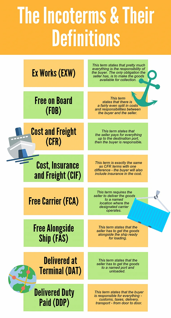 Don't know what the 3 letters that came with your quote mean?. Terms of Delivery In international commerce, an agreement between the seller and the buyer as to who is responsible for the cost and risk of delivering the goods Cost and risk may rest exclusively with either party, or may be split at a certain point The International Chamber of Commerce has set approximately a dozen different terms of delivery. By defining who’s responsible for shipping, insurance and tariffs, the Incoterms rules ultimately determine your final costs as either a buyer or a seller To help you understand the intricacies of these terms—and what they mean for you—we’ll walk you through all eleven of the 10 Incoterms Rules.