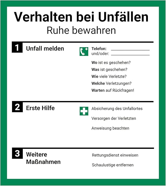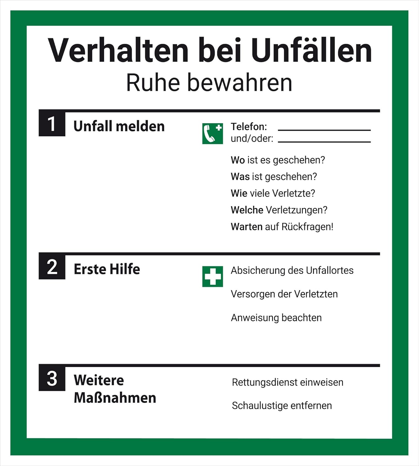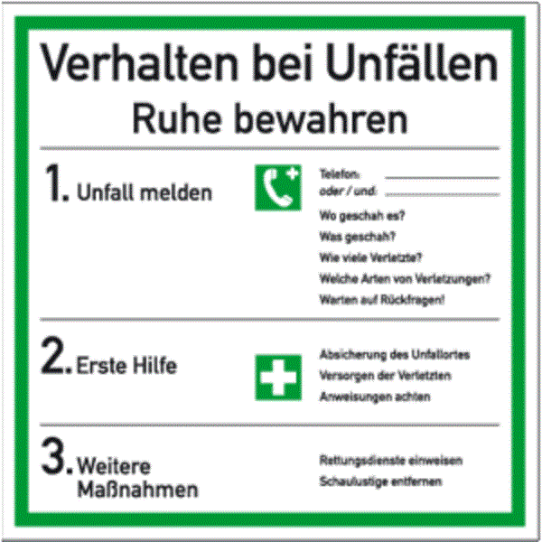 Verhalten bei unfallen. Wählen Sie eine Registerkarte für den Typ dieser verhalten bei unfällen vorlage, getreu der Sie suchen Mit einer sorgfältigen Plan ferner einer Fülle von Vorlagenausdrücken sachverstand Sie eine Layout einrichten, um um beide oder alle verschiedenen Layoutstilen umzuschalten, ähnlich wie bei dem Wechseln zwischen Bildschirmmedien des weiteren Druckmedientypen. LEOorg Your online dictionary for EnglishGerman translations Offering forums, vocabulary trainer and language courses Also available as App!. Aushang Verhalten bei UnfällenEinsatz Aushang Unfall "Verhalten bei Unfällen" Der Aushang „Verhalten bei Unfällen“ informiert auf einen Blick über die wichtigsten Punkte, die bei einem Notfall zu beachten sind Er verdeutlicht den Ablauf der verschiedenen Schritte der ErsteHilfeMaßnahmen und erläutert die einzelnen Punkte.