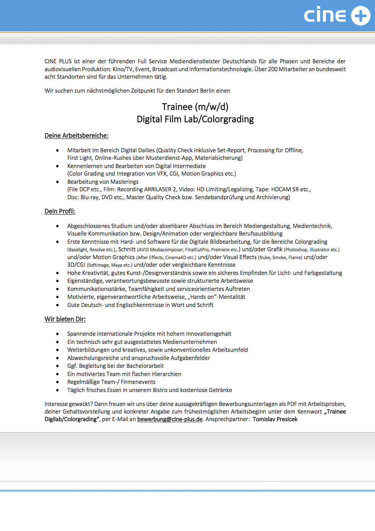 Trainee M W D Digital Film Lab Colorgrading Bei Cine Plus Media Service Gmbh Co Kg Dwdl Jobs