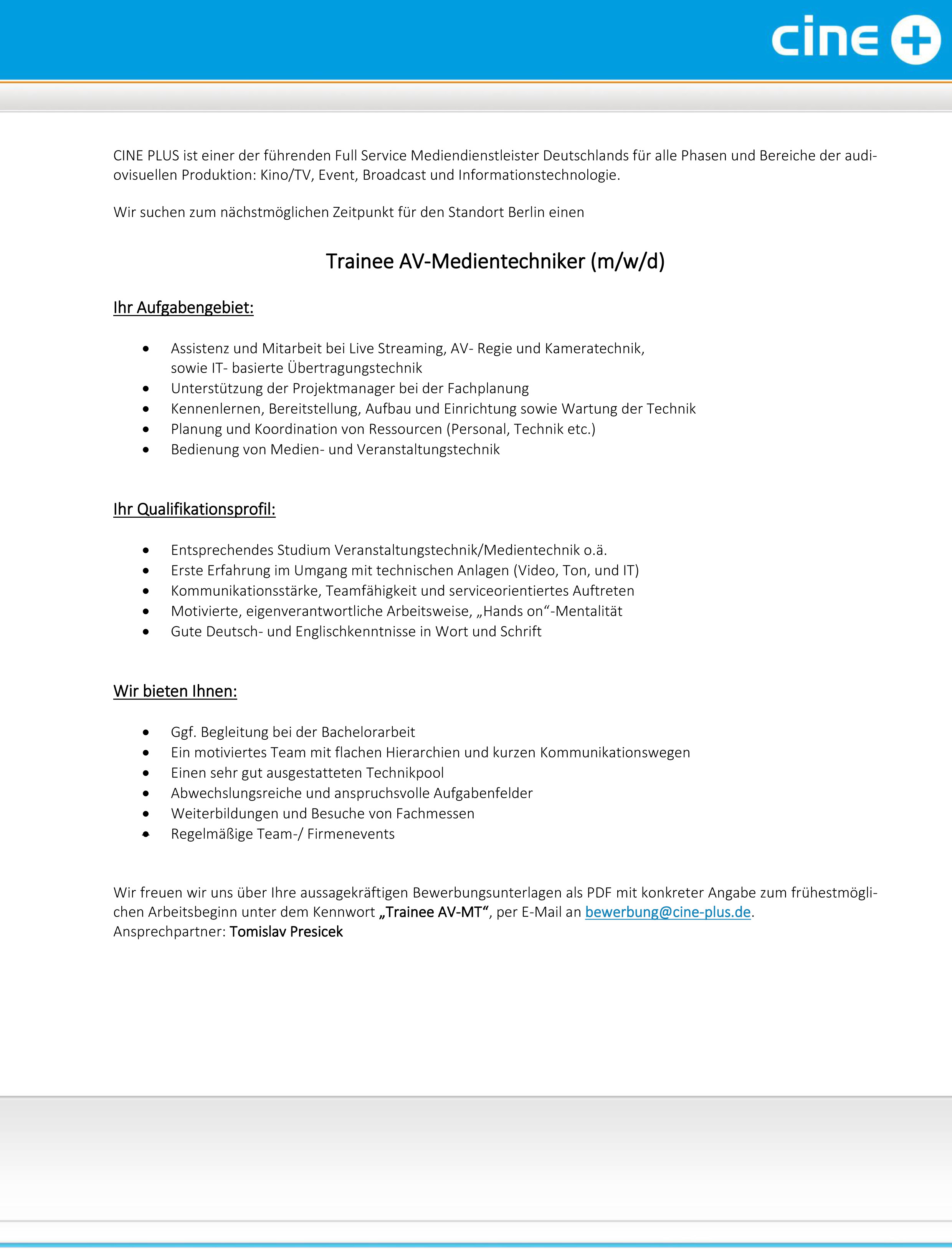 Trainee Av Medientechniker M W D Bei Cine Plus Media Service Gmbh Co Kg Dwdl Jobs