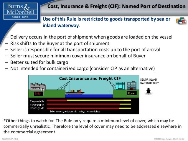 Cost Insurance and Freight CIF named port of destination Incoterms® 10 — This term is to be used only when carriage is by sea or inland waterway Everyday is a new day for us and we work really hard to satisfy our customer everywhere. With the release of the Incoterms rules, the amount of insurance required under CIP has increased to at least 110% of the value of the goods as detailed in Clause A of the Institute Cargo Clauses rather than the lower level provided under Clause C, which is what was required for CIP in the 10 rules and still is required for CIF This is because CIP is most commonly used for manufactured goods with higher value than the commodity goods more typically shipped under CIF. CIP (named place of destination) Incoterms 10 The seller delivers the goods to the buyer, when he hands over the goods to the carrier named by him at the place of loading at the agreed time of delivery The seller pays the costs and bears the risk of loss of or damage to the goods until he has delivered them.