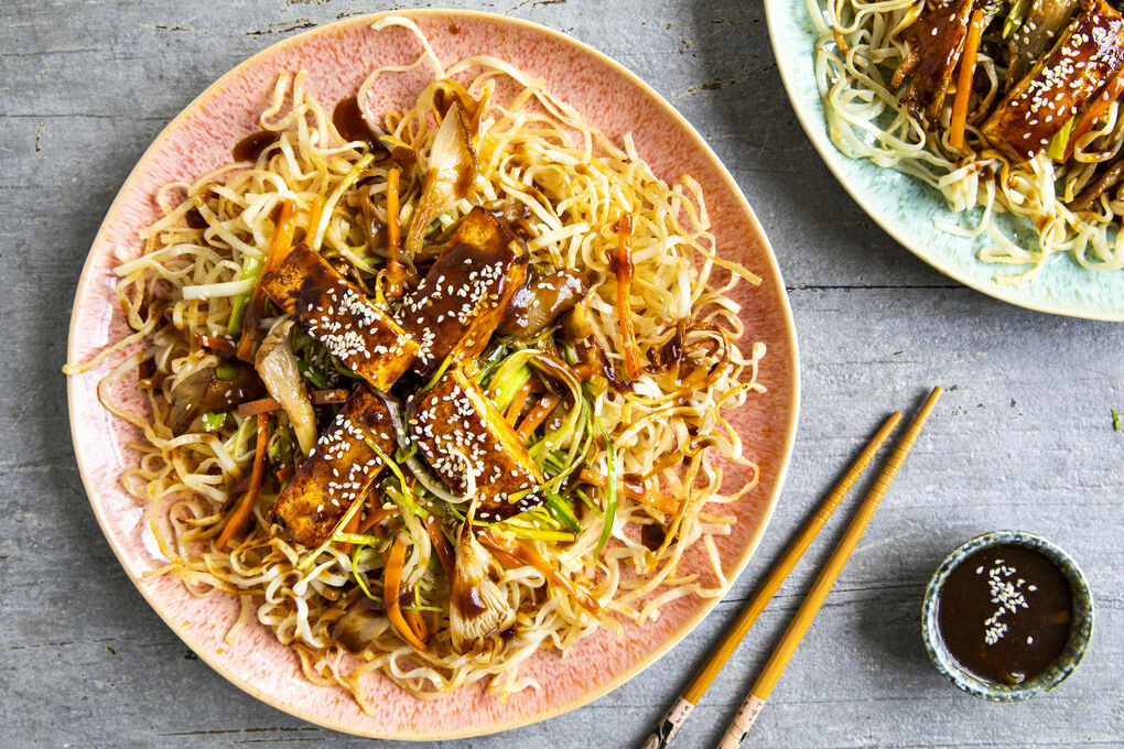 Kantonesische Tofu Austernpilz Pfanne Mit Breiten Nudeln Und Hoisinsauce Marley Spoon