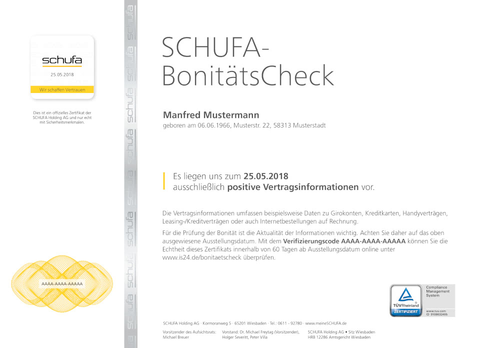 Der SCHUFABonitätsCheck ist speziell für Mieter konzipiert. Positive Schufa Auskunft Muster 23 Apr 23 April 18 0 0 Posted by vsadmin Kein Kredit trotz Positiver Schufa Wir bieten Ihnen Informationen zur Bonität, die nicht nur nützlich sind, sondern auch schützen!. SchufaAuskunft als wichtiges Bonitätsmerkmal Die in der Schufa gespeicherten Daten, insbesondere die SchufaMerkmale, stellen vor allem für Banken ein wichtiges Mittel dar, um die Bonität der Kunden zu beurteilen Neben dem Einkommen ist bei zahlreichen Krediten die SchufaAuskunft das wichtigste Merkmal, welches die Kreditinstitute zur.