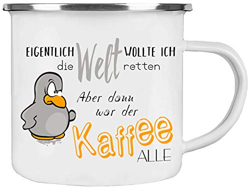 Cadouri Emaille Tasse Eigentlich Wollte Ich Die Welt Retten Aber Dann War Der Kaffee Alle Kaffeetasse Burotasse Spruchetasse Outdoortasse 300 Ml Amazon De Handmade
