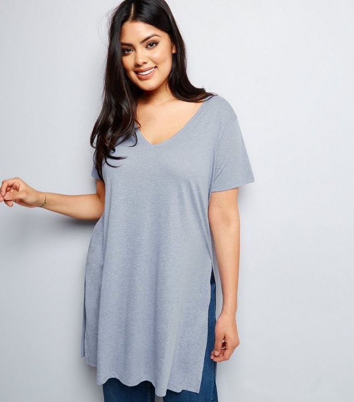 Curves Graues Langes T Shirt Mit Seitenschlitzen New Look