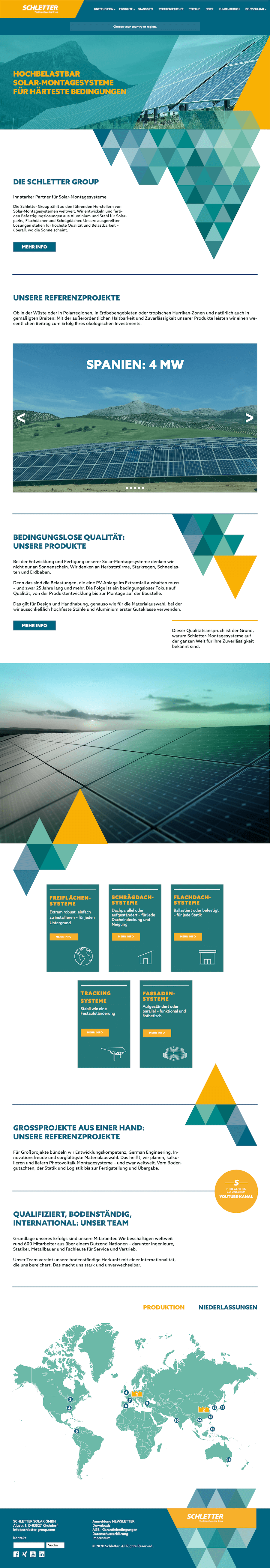 Die SchletterGruppe mit Sitz in Kirchdorf / Haag in Oberbayern zählt zu den führenden Herstellern für PhotovoltaikMontagesysteme aus Aluminium und Stahl weltweit Die Gruppe fertigt Montagesysteme für Dächer, Fassaden und Freiflächen (Solarparks) sowie Carports für Privat und Gewerbekunden. Schletter Solar GmbH Die SchletterGruppe zählt zu den führenden Herstellern von PhotovoltaikMontagesysteme aus Aluminium und Stahl weltweit Die Gruppe fertigt Montagesysteme für Dächer, Fassaden und Freiflächen (Solarparks) sowie SolarCarports. DIE SCHLETTER GROUP Ihr starker Partner für SolarMontagesysteme Die Schletter Group zählt zu den führenden Herstellern von SolarMontagesystemen Page load speed analysis 65/100.