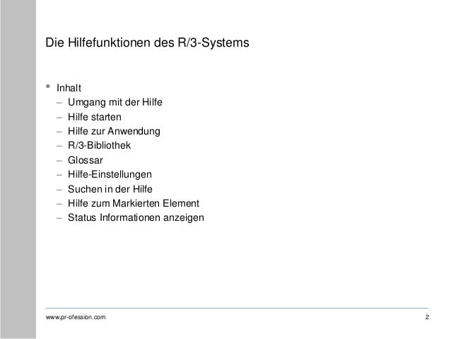 SAP • Die Hilfe zur Anwendung, die Sie über das Menü Hilfe aufrufen können, ist kontextbasiert Das heißt, Sie werden direkt zur Hilfe für den jeweiligen Anwendungsbereich des aktuellen Systems. Das SAPDeckblatt enthält Adressdaten und das Selektionsdeckblatt fasst die Auswahlbedingungen zusammen Über die Funktion „ Hilfe zur Anwendung “ ruft R/3 die „ SAPBibliothek “ an einer Stelle auf, an der Ihre aktuelle Bearbeitung behandelt wird In den Benutzervorgaben können Sie Ihre „ Adressdaten “ angeben, über die. Im weiteren Verlauf können alle Änderungen ohne weitere Eingriffe im SAPSystem realisiert werden Die Zugriffsmöglichkeiten auf die originäre „Hilfe zur Anwendung“ der SAP bleibt auf Wunsch erhalten Alternative zur SAP help Kontextsensitive Hilfen können auch mit Hilfe der SAPWPB (ehemals Datango) erstellt werden.