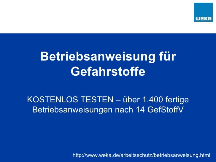 Betriebsanweisungen für Gefahrstoffe Hier eine Auswahl von Musterbetriebsanseisungen Weitere Betriebsanweisungen nach § 14 Gefahrstoffverordnung finden Sie unter WINGIS online oder auf der WINGISCDROM Betriebsanweisung gemäß § 14 GefStoffV (blanko) Gliederungsmuster einer Betriebsanweisung. Hierzu gehört auch das Erstellen einer Betriebsanweisung nach § 14 Gefahrstoffverordnung GefStoffV Diese Betriebsanweisung muss bei jeder maßgeblichen Veränderung der Arbeitsbedingungen aktualisiert werden Die Beschäftigten müssen anhand der Betriebsanweisung mündlich in der für sie verständlichen Form unterwiesen werden. Für Gefahrstoffe Betriebsanweisung und Information der Beschäftigten TRGS 555 Die Technischen Regeln für Gefahrstoffe (TRGS) geben den Stand der Technik, Arbeitsmedizin und Arbeitshygiene sowie sonstige gesicherte arbeitswissenschaftliche Erkenntnisse für Tätigkeiten mit Gefahrstoffen, einschließlich deren Einstufung und.