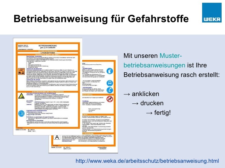 Dies bedeutet, dass Gefahrstoffe, die innerhalb einer Schicht verarbeitet werden, nicht den Regelungen der Lagerung unterliegen Ausgenommen sind auch Gefahrstoffe in kleinen Mengen, die regelmäßig im Gebrauch sind Dabei handelt es sich zB um Farben oder Sprays in einer Werkstatt, die zwar nicht täglich aber regelmäßig verwendet werden. Betriebsanweisung (BA) ist nur der Oberbegriff über eine ganze Reihe verschiedenster Arbeitsanweisungen, die bei Arbeiten mit gefährlichen Stoffen (das können sowohl Chemikalien als auch gentechnisch veränderte Organismen sein), komplizierten und/oder gefährlichen Maschinen sowie bei unfallgefährdeten Tätigkeiten einen erprobten und sicheren Arbeitsablauf gewährleisten sollen. Betriebsanweisung Beim Umgang mit Gefahrstoffen und bei anderen gefährdenden Tätigkeiten ist eine Betriebsanweisung zu erstellen Mit der Betriebsanweisung sollen den Beschäftigten die Gefährdungen bewusst gemacht und notwendige Schutzmaßnahmen aufgezeigt werden Liste der Betriebsanweisungen für Arbeitsmittel Þ, Gefahrstoffe.