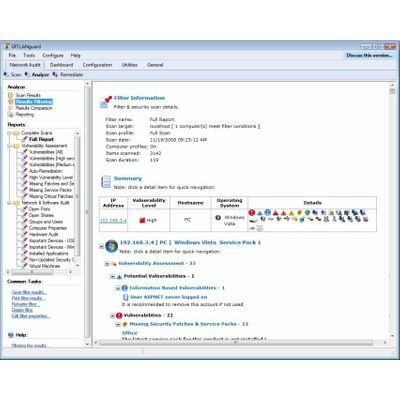 LANguard Network Security Scanner is a powerful application that offers network vulnerability scanning, patch management and network auditing The program can scan the entire network and offer NETBIOS information for all workstations like the full software details. The default scanning profiles in LanGuard are already preconfigured to run many network and software audit checks on the selected target You can customize the list of network and software audits executed during a scan or even disable in case you are interested only in the Vulnerability and Patches checks. Try GFI LanGuard network security scanning, patch management and vulnerability assessment free for 30 days by registering.