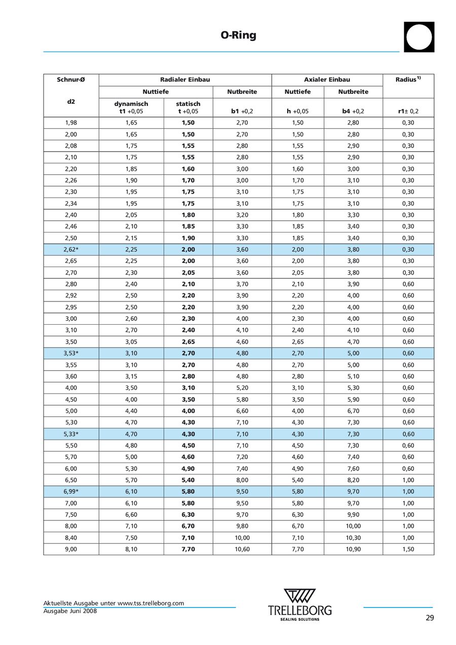 2 ORing Handbook Parker Hannifin ORing Division Europe Created Date 7/7/15 PM. Im Gegensatz zu einem ORing liegt der Formliniengrat in der Mulde zwischen den entscheidenden Dichtlippen und in ausreichendem Abstand von ihnen Wichtiger Hinweis QuadRing ® Einbaumaße Standardempfehlungen Schnur Durchmesser W 1 Nut Abmessungen Radius 3)Nut Breite** r Radiales Spiel S max Nut Tiefe* 1 Dynamisch t 1 0,05 Statisch t. ORing Einbaumasse Einbauraum Alle anderen in dieser Tabelle angegebenen Werte wurden von den in der DIN 3771, Teil 5 empfohlenen Daten abgeleitet.
