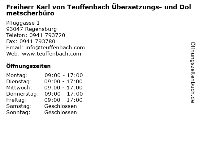 ᐅ Offnungszeiten Ubersetzungs Und Dolmetscherburo Freiherr Karl Von Teuffenbach Dipl Kfm Pfluggasse 1 In Regensburg Innenstadt