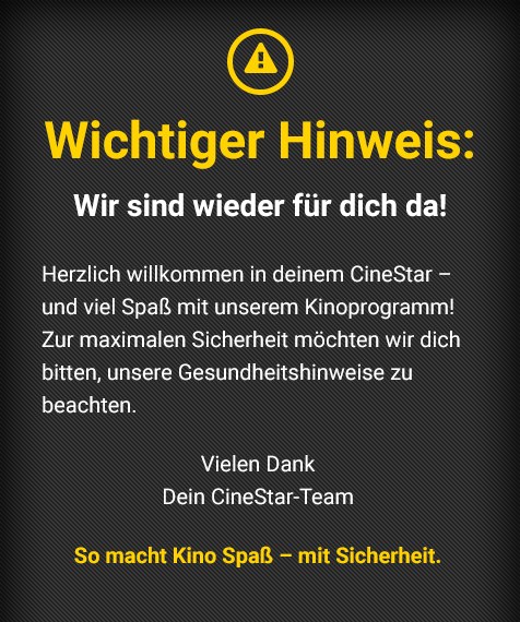 As the name suggests, CineStar Original only plays films in the original version With its mainstream programme and central location in the Sony Center, CineStar attracts many of Berlin's Englishspeaking cinemagoers, as well as innumerable tourists. Bitte wendet euch dazu an unser Team per EMail an info@cinestarde Die CineStarGutscheine , die aufgrund der gesetzlichen Verjährungsfrist am 3112 abgelaufen sind, werden durch die pandemiebedingten Schließzeiten derzeitig bis zum verlängert. As I was saying before I rudely interrupted myself The Cinestar Original IS THE PLACE to go for English Language movies There are other cinemas that also offer an English language.