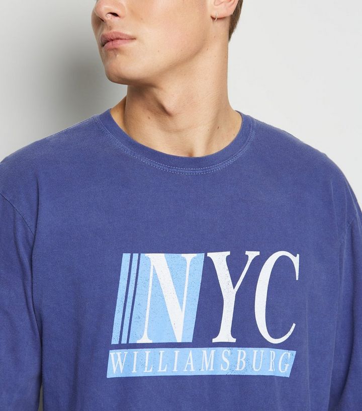 Blaues Uberfarbtes T Shirt Mit Langen Armeln Und Nyc Slogan New Look