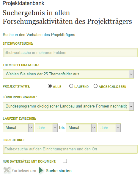 Bundesprogramm Ökologischer Landbau Bitte beachten Sie, dass die archivierten Meldungen nicht aktualisiert werden Möglicherweise sind die Inhalte der Meldungen inzwischen nicht mehr gültig. Ökologischer Landbau Bundesprogramm Ökologischer Landbau und andere Formen nachhaltiger Landwirtschaft Die Geschäftsstelle des Bundesprogramms ist bei der BLE angesiedelt und dort zuständig für Informationsmaßnahmen, Forschungsförderung und Internetportale im Bereich Ökolandbau und Nachhaltige Landwirtschaft. Unter wwwpraxisversuchede steht ein OnlineLeitfaden zur Verfügung, der Landwirte und Gärtner bei der Durchführung von Feldversuchen unterstützt Der Leitfaden wurde im Rahmen des Bundesprogramms Ökologischer Landbau vom Forschungsinstitut für biologischen Landbau (FiBL Deutschland eV) in Zusammenarbeit mit dem Zentrum für Agrarlandschafts und Landnutzungsforschung (ZALF) eV.