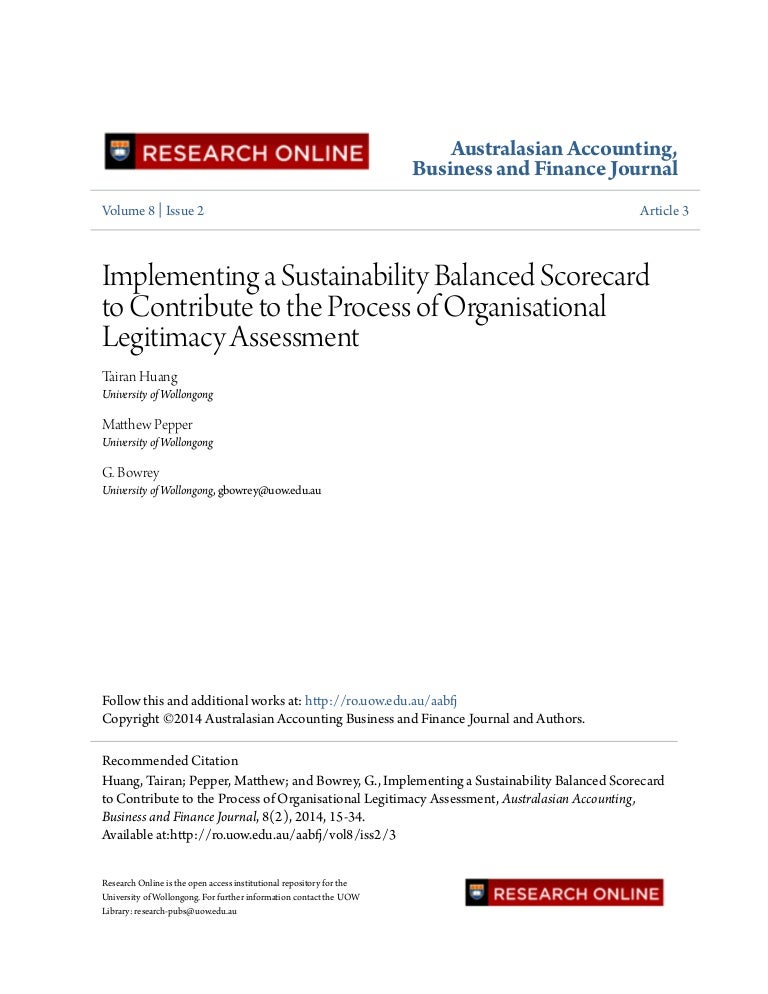 A balanced scorecard for sustainability reporting is proposed and evaluated The layout of the paper is a follows Section 2 discusses the research problem and objectives for this study. 2 A Practitioner’s Guide to the Balanced Scorecard Kaplan and Norton’s Balanced Scorecard is a concept still widely used and respected in today’s business environment What follows, provides guidance and advice on the development and implementation of a Balanced Scorecard for those organisations considering the introduction of a. Chiu, A performance assessment approach for integrated solid waste management using a sustainable balanced scorecard approach, Journal of Cleaner Production, /jjclepro, 251, (), ().