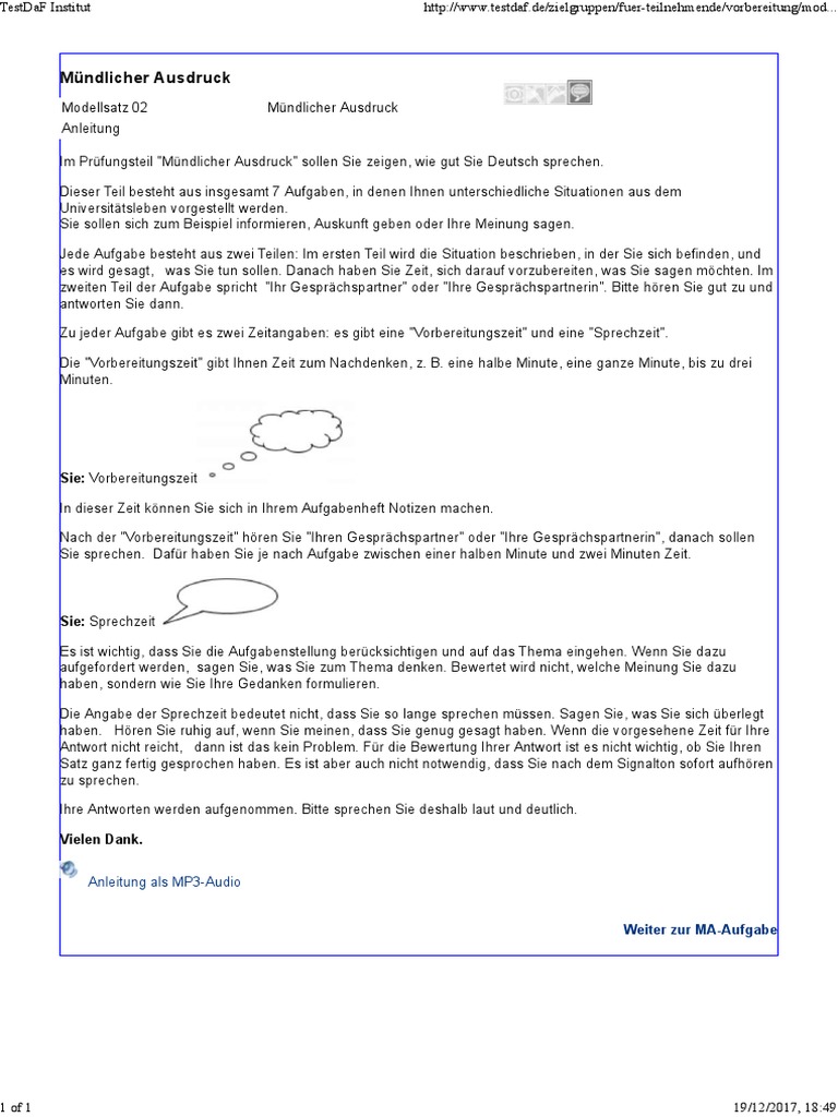 Testdaf mundlicher ausdruck. TestDaF Mündlicher Ausdruck – eine ganz spezielle Prüfung Anders als in allen mir bekannten Prüfungsformaten für Deutsch als Fremdsprache gibt es in dieser mündlichen Prüfung keine tatsächlich anwesenden PrüferInnen Die Prüfungsteilnehmenden sitzen am Computer und die Aufgaben werden der Reihe nach abgespielt. After passing the TestDaF with a pretty good score in February 14, I do have a lot to say about the test To read my top tips for taking the exam, check out the following links TestDaF Tips Leseverstehen;. It’s fast, it’s fun and it’s mindbogglingly effective.