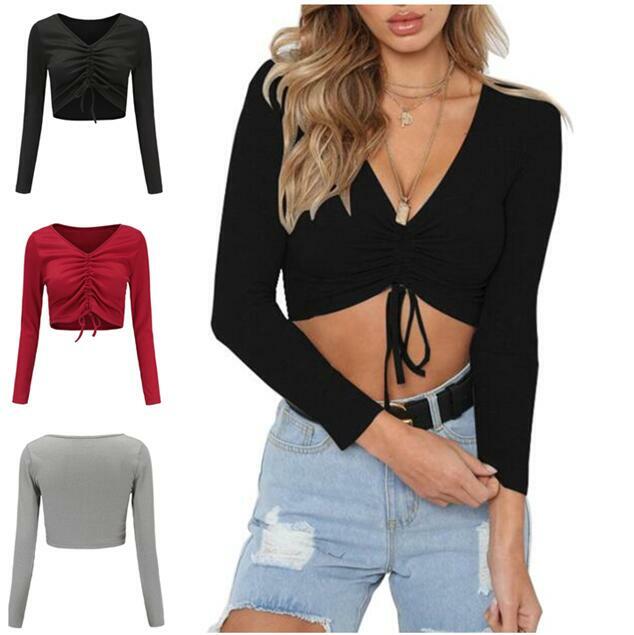 Damenmode Mini T Shirts Bauchfrei Langarm Tops Kordelzug Korsage Cross Fit Neu B Ebay