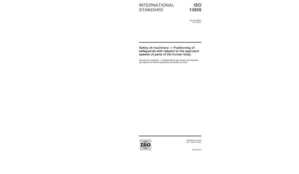 ISO establishes the positioning of safeguards with respect to the approach speeds of parts of the human body It specifies parameters based on values for approach speeds of parts of the human body and provides a methodology to determine the minimum distances to a hazard zone from the detection zone or from actuating devices of safeguards. ISO Standard Environmental management systems;. UNE EN ISO Safety of machinery Positioning of safeguards with respect to the approach speeds of parts of the human body (ISO ) Seguridad de las máquinas Posicionamiento de los protectores con respecto a la velocidad de aproximación de partes del cuerpo humano (ISO ).