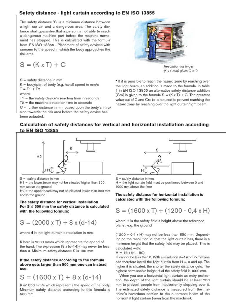 View the "EN ISO " standard description, purpose Or download the PDF of the directive or of the official journal for free. EN ISO applies to safety light curtains as well as to other devices such as pressuresensitive mats, twohand control systems and interlocking guards without guard locking In simple terms, the standard is intended to ensure accessible hazards with mechanical movement are protected by electrosensitive protective equipment (ESPE). These distances are defined in standards such as ISO When installing a light curtain, be sure to provide the safety distance (minimum distance) determined by sources such as the standards, regulations, and laws of the country or area in which the light curtain will be used Calculating the Safety Distance according to ISO.