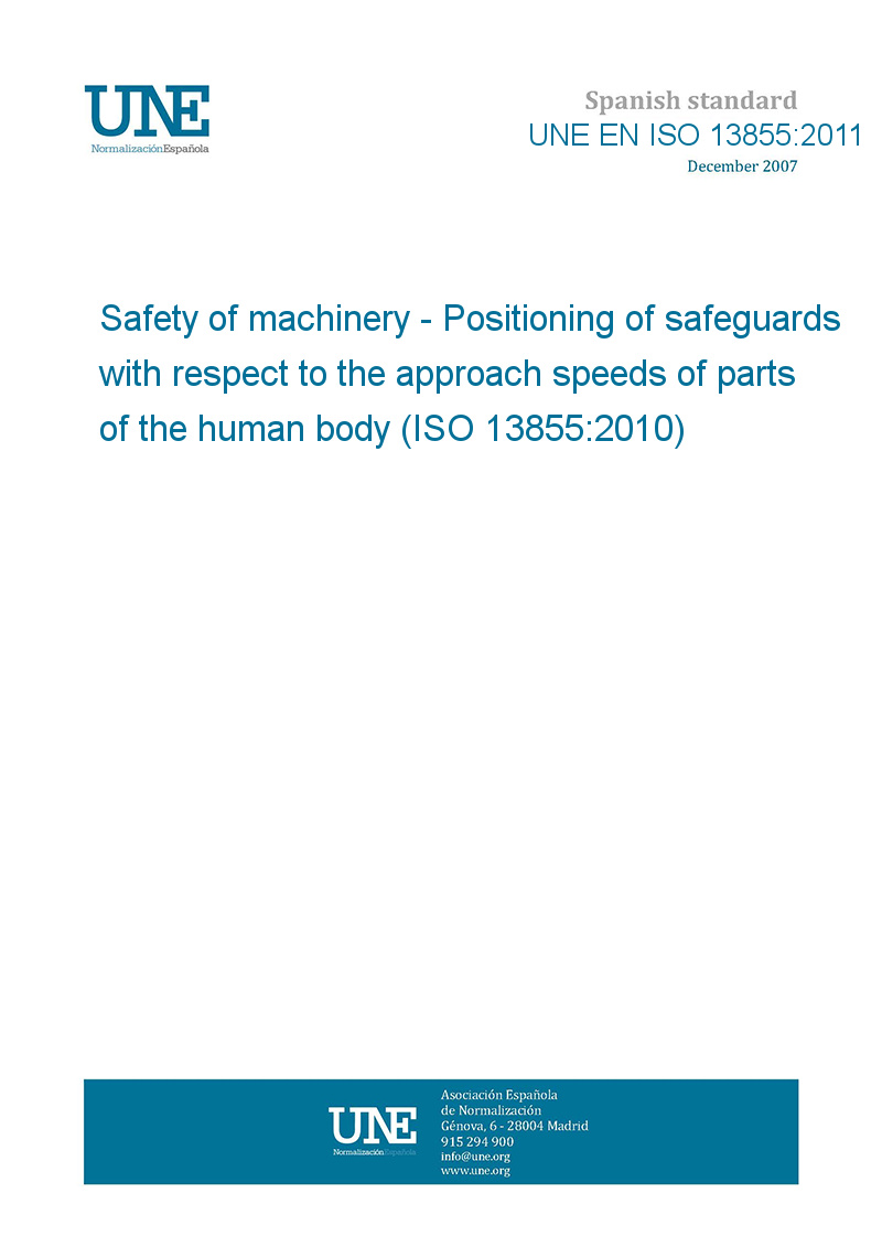 In der EN ISO werden in erster Linie sogenannte Annäherungsgeschwindigkeiten des Menschen definiert Diese Annäherungsgeschwindigkeiten sind bei der Auslegung von Sicherheitsmaßnahmen und der Wahl geeigneter Sensorik zu berücksichtigen Hierbei werden, je nach Annäherungsrichtung und Art, unterschiedliche Geschwindigkeiten und Schutzgrößen festgelegt. UNEEN ISO Seguridad de las máquinas Posicionamiento de los protectores con respecto a la velocidad de aproximación de partes del cuerpo humano (ISO ) Safety of machinery Positioning of safeguards with respect to the approach speeds of parts of the human body (ISO ). UNE EN ISO 11 Current Current The latest, uptodate edition Email;.