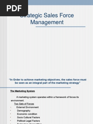 Sales force management. Sale Force Management is the primary link between the Product offered by the Company and the end consumer that will buy the product Over a decade the firms have a single goal of earning profit and making sales The Sales Team was recruited to search for the present and potential customers and to make the sale. Sales force management helps boost your sales team’s productivity and reach sales objectives In turn, these boosts will increase business revenue Having a good product and service is not adequate to sustain business growth. Sales Force Management presents a blend of leadingedge research and realworld strategy in a highly readable, studentfriendly writing style.