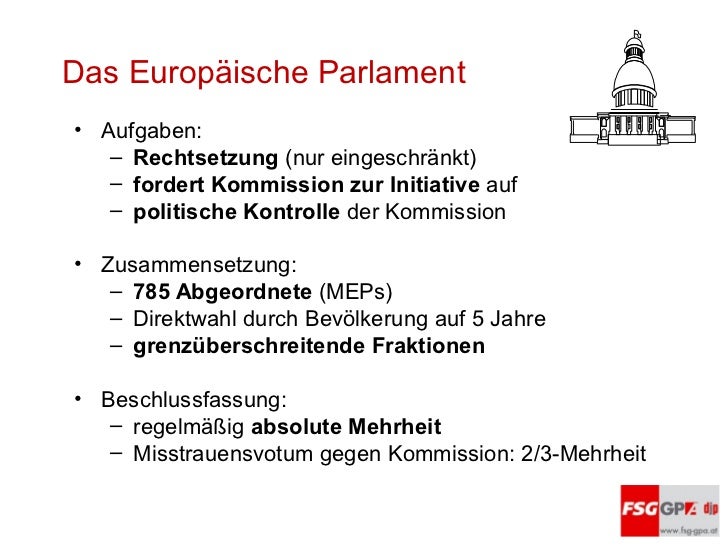 Die Abgeordneten werden seit 1979 alle 5 Jahre in freien, allgemeinen, unmittelbaren und geheimen Wahlen. Europäisches Parlament Regierungschef Die Europäische Union hat keinen Regierungschef Die Europaabgeordneten müssen der Ernennung des Präsidenten der Europäischen Kommission wie auch der Zusammensetzung der gesamten EUKommission zustimmen Ein Zehntel der Parlamentarier kann einen Misstrauensantrag gegen die EUKommission stellen. „Europäisches Parlament“ war zunächst eine (1962 erstmals verwendete) Selbstbezeichnung und wurde mit Inkrafttreten der Einheitlichen Europäischen Akte von 1986 auch primärrechtlich verankert Zusammensetzung und Untergliederungen Das Europäische Parlament hat zur Zeit 785 Abgeordnete Die Notwendigkeit angemessener.