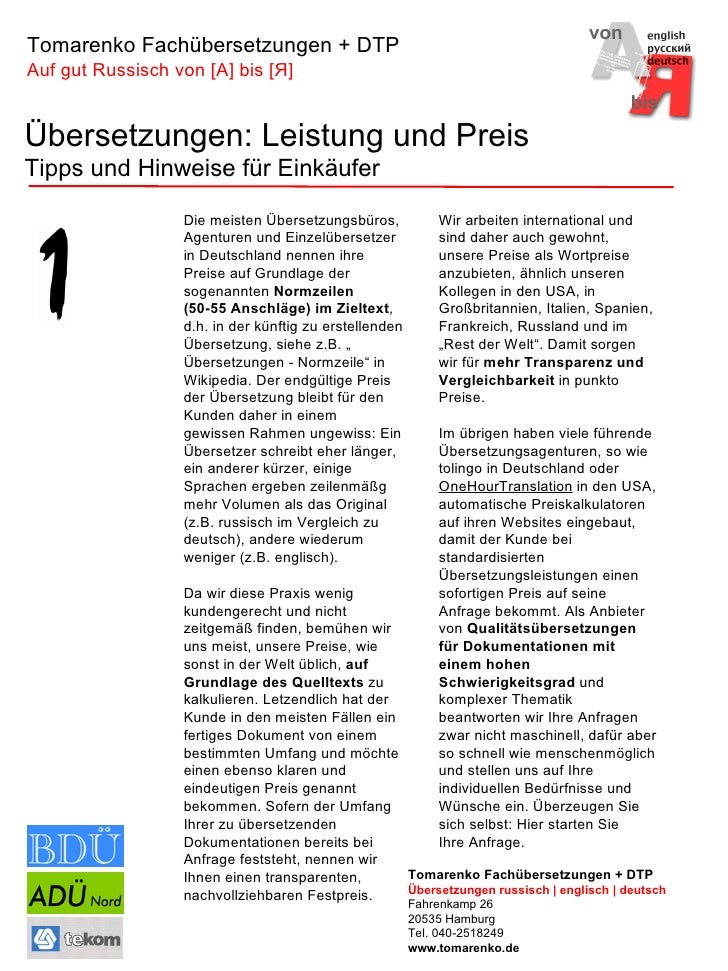 Preisübersicht für hochwertige Übersetzungsdienstleistungen in den Sprachen Englisch / Deutsch BeispielZeilenpreise für versch ÜbersetzungsAufträge Twigg's Translations Übersetzungsbüro ist auf die Sprachen Englisch und Deutsch spezialisiert. Wir bieten ein hervorragendes PreisLeistungsVerhältnis Lassen Sie sich von unseren Referenzen überzeugen premier translations Ihre perfekte Quelle für erstklassige Deutsch–Englisch Übersetzungen Wir fertigen Fachübersetzungen vom Deutschen ins Englische und umgekehrt in einer Reihe von Bereichen an Wirtschaft. Die Sprachenkombination EnglischDeutsch ist da bedeutend häufiger anzutreffen, weshalb es unter den Übersetzern mehr Konkurrenzkampf gibt Dies führt natürlich zu einem geringeren Preis Dies führt natürlich zu einem geringeren Preis.
