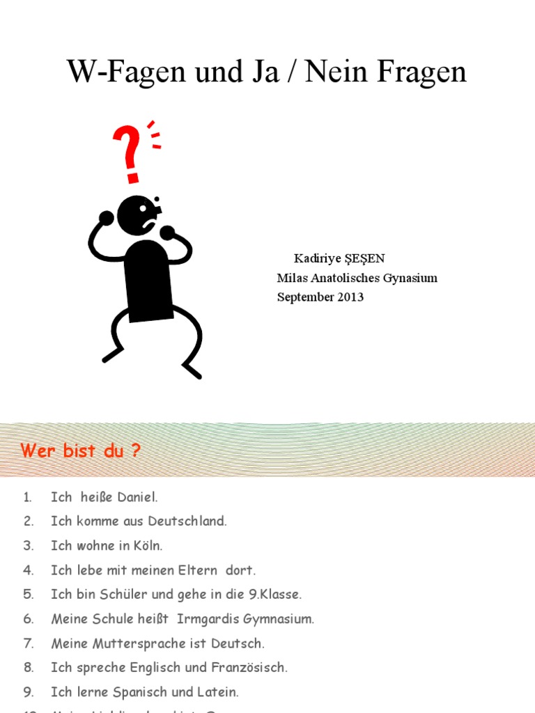 Today we will learn Ja / NeinFragen (ye,”) To ask such a question you need to move the verb from the second place, as in the affirmative sentence, to the first Er heißt Anshu – his name is Anshu. Ja/Nein Fragen Bei Ja/Nein – Fragen sind Fragen, wo man sich entscheiden muss Die möglichen Antworten sind „ja“, „nein“ oder „doch“ (bei negativen Fragen). Nein 9 bist du verliebt?.