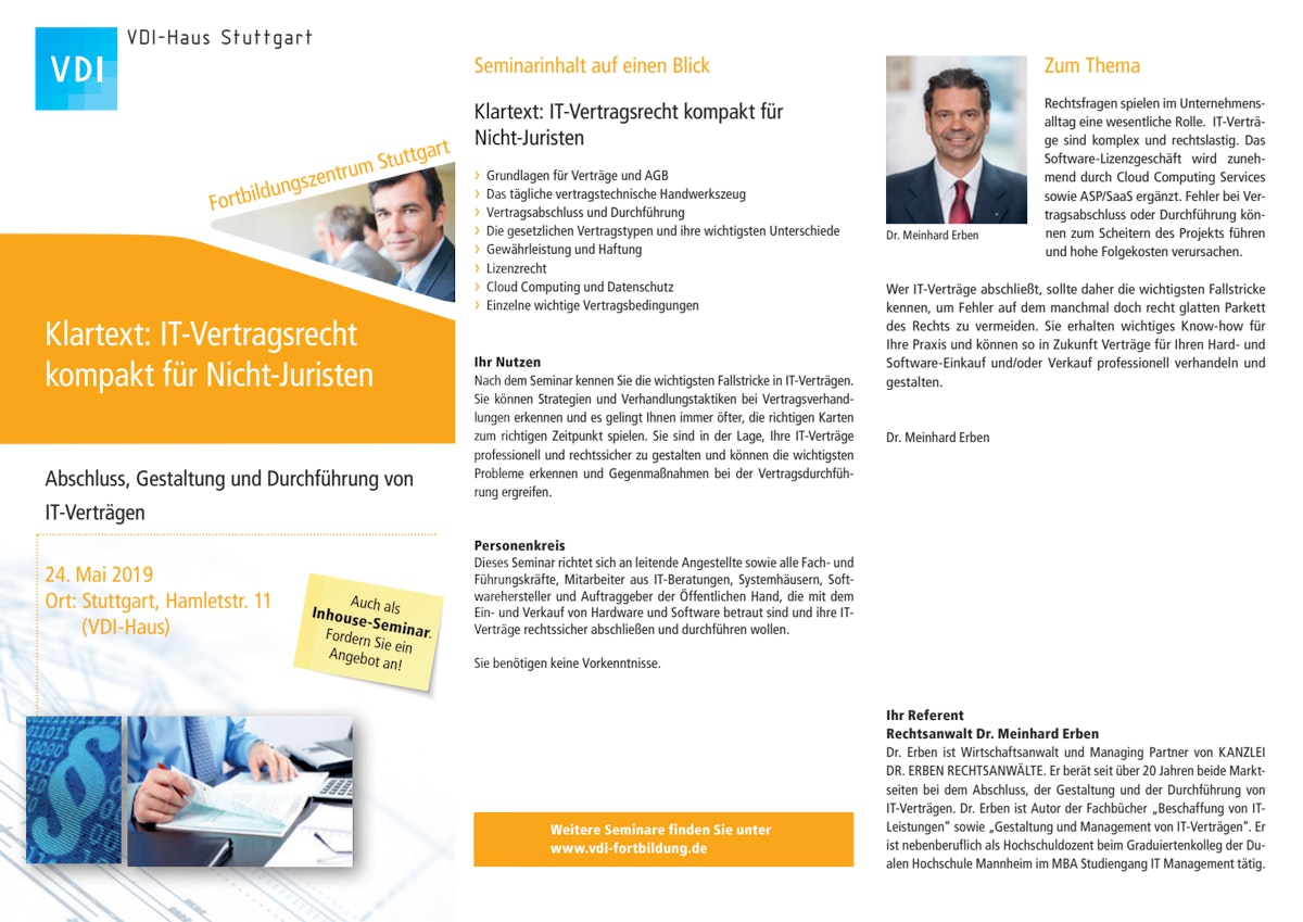 Seminar Weiterbildung für Führungskräfte und Selbständige;. Für Nichtjuristen ist eine solide Grundkenntnis auf diesem Gebiet unerlässlich Das Seminar führt Sie in das Gebiet des Vertragsrechts ein, bietet Ihnen das relevante Handwerkszeug, erklärt die praxisrelevanten Vertragstypen mit ihren Eigenheiten und erläutert die wichtigsten Vertragsbedingungen je Vertragstyp. IT Vertragsrecht für Nichtjuristen Neu Thema Das Seminar verschafft Ihnen einen Überblick über die Grundlagen und die Strukturen des ITVertragsrechts und die wichtigsten Rechtsfragen rund um ITLeistungen Im Zuge des Seminars erkennen Sie, dass die für Ihr tägliches Vertragsmanagement rechtssensiblen Szenarien zwar nicht ganz einfach.