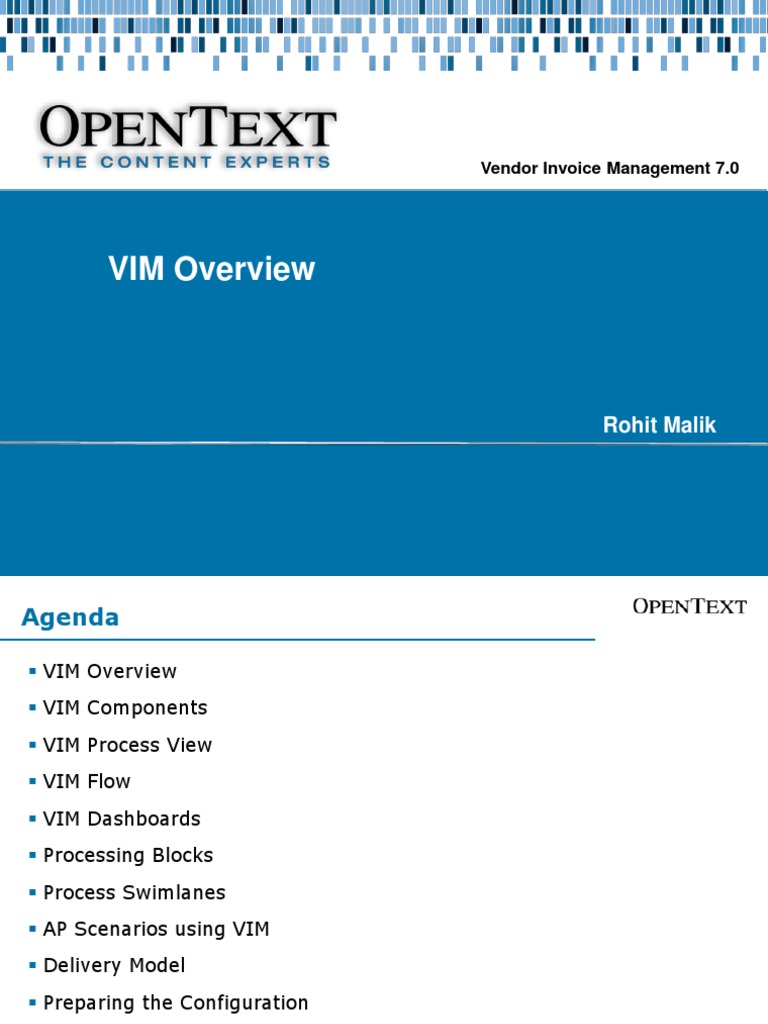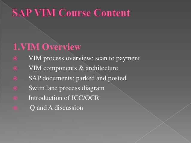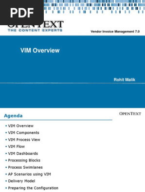 OpenText™ Vendor Invoice Management for SAP ® Solutions Configuration Guide The OpenText™ Vendor Invoice Management for SAP ® Solutions Configuration Guide describes the technical aspects of configuring OpenText Vendor Invoice Management (VIM Elena Fuentes PDF Download Free PDF. VIM Vendor Invoice Management is an OpenText Tool which helps AP(Accounts payable) team perform their daytoday duties smoothly VIM ensures of reducing duplicate payments and making vendor. SAP® Vendor Invoice Management by OpenText allows the automation, standardization and unification of accounts payable processes at a global level Inglés It is 100% integrated with SAP MM and FI invoice verification, both in SAP ERP and in SAP S / 4HANA.