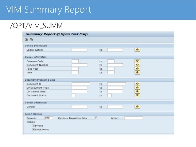 OpenText™ Vendor Invoice Management for SAP® Solutions is an industry leading invoice management and processing solution An integral part of SAP, Vendor Invoice Management for SAP® Solutions includes preconfigured rules, roles and actions to fully automate invoice receipt and posting. Automates invoice review, approval and exception handling early in the payment process;. SAP VIM Main Tcodes SAP VIM is a OpenText Solution for Vendor Invoice Management and integration into SAP In the following articles, we will discuss the main SAP VIM Tcodes or SAP VIM transaction codes In order to simplify, I have decided to split the list of SAP VIM OpenText transaction code into 2 articles.