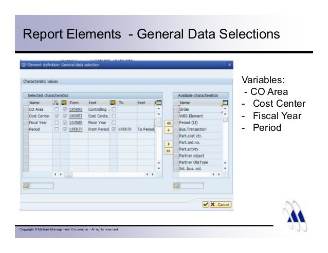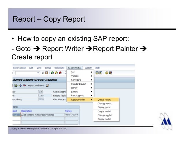 2 thoughts to “SAP Cost Center Accounting3 (Report Painter)” Pingback sap controlling overview Pingback SAP Cost Center Accounting2 SAP FINANCE and Treasury Comments are closed Post navigation SAP Cost Center Accounting2 SAP Product Costing – 1 Translate Search for Log In Username or Email Address. With Report Painter you can define reports quickly and easily across rows and columns You can use standard reports delivered by SAP as a base, copy them and do minor modifications, so as to suit your requirement Very often it is felt that the standard reports delivered by SAP do not meet the users requirement. UNIT 1 Introduction to the Report Painter and Report Writer Lesson 1 Introducing the Report Painter and Report Writer Lesson Objectives After completing this lesson, you will be able to List the reporting tools available in the SAP system Explain the uses of the Report Painter Lesson 2 Understanding the Report Writer Components Lesson Objectives.