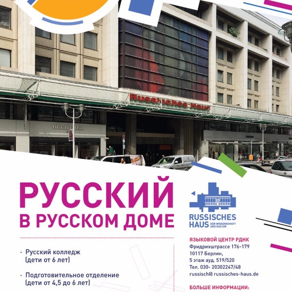 Das Russische Haus der Wissenschaft und Kultur befindet sich auf einer der zentralen Straßen Berlins – der Friedrichstraße Das siebenstöckige Gebäude wurde 1984 eingeweiht und entstand nach Plänen. Facebook Russische Sprache und Bildung и Sprachzentrum Russisches Haus der Wissenschaft und Kultur Наши банковские реквизиты Russisches Haus der Wissenschaft und Kultur Berliner Volksbank Kontonummer BLZ 100 900 00 Berlin Тел 49 30/ 30 22 52. Российский дом науки и культуры в Берлине Кино Театр Балет Курсы русского языка Концерты Музей Библиотека Выставки Секции и клубы для детей и взрослых Das Russische Haus der Wissenschaft und Kultur in Berlin.