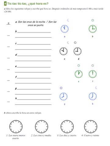 Daher nicht wann ich am Ende 'de la manana', 'de la tarde' oder 'de la noch' eintragen muss. Tablets Lernen Sie Spanisch wesentlich schneller als mit herkömmlichen Lernmethoden Uhrzeit auf Spanisch lernen mit bungen mit Lösungen und direter AuswertungMit dieser bung lernst du nicht nur kostenlos das Ausschreiben der Uhrzeit, sondern auch das. Haben Sie anspruchsvolle Uhrzeiten und möchten Sie Ihren Spanischunterricht leichter mit Ihren Tätigkeiten organisieren?.