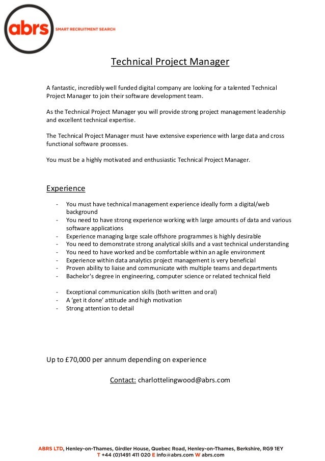 A technical project manager straddles the line between technical savvy and organizational skill As I mentioned in my earlier blog, this combination makes him prone to the same kinds of. ROLE – Technical Project Manager LOCATION – Basingstoke SALARY £30k £35k Are you an they are now looking to recruit for an additional Technical Project Manager to join their on time and within customer expectations The Technical Project Manager will ideally have The Technical Project Manager will ideally have the following skills/experience 2 – 3. The average salary for a Technical Project Manager is $93,623 Visit PayScale to research technical project manager salaries by city, experience, skill, employer and more.