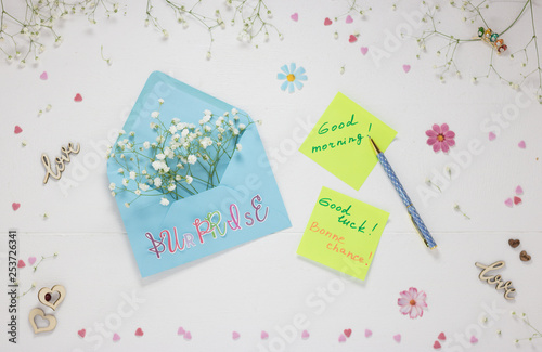 Surprise Flowers In Envelope And Wishes Notes Good Morning Good Luck And Bonne Chance Are On White Wooden Desk Background Concept Congratulations And Wishes Buy This Stock Photo And Explore Similar