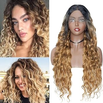 70cm Glueless Lace Front Perucken Ombre Schwarz Bis Dunkelblond Welle Lange Lose Gewellte Lockige Dunkle Wurzeln Hitzebestandige Kunsthaar Volle Perucke Mit Naturlichem Haaransatz Amazon De Beauty