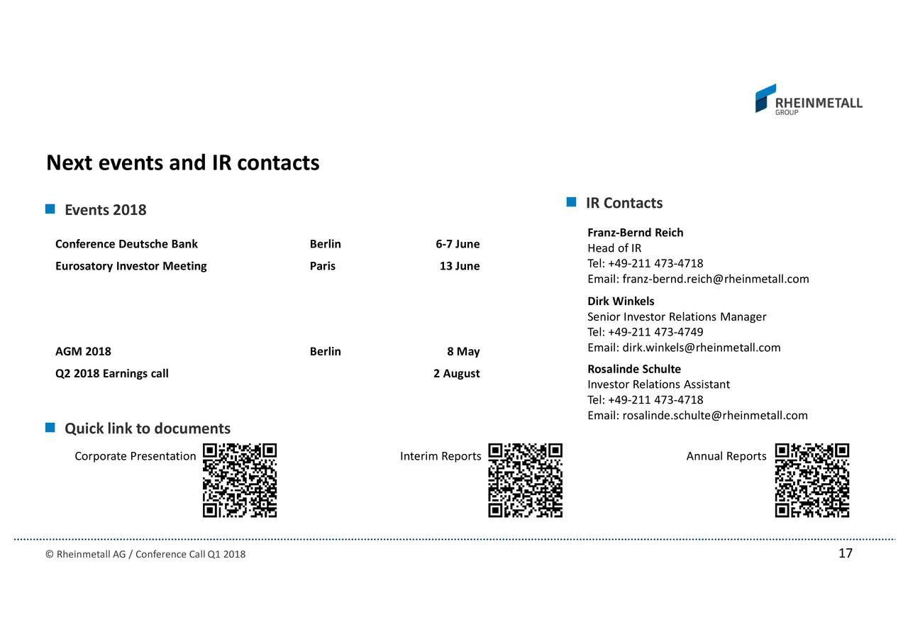 When registering for and using Rheinmetall AG’s Investor Relations Event Reminder service, your personal data will be used exclusively for the purpose of sending emails with information regarding events organised by the Rheinmetall Group or in which companies of the Rheinmetall Group are participating. Press release Download Package zip;. Senior Investor Relations Manager Tel Email reneweinberg@rheinmetallcom Rosalinde Schulte Investor Relations Assistant Tel.